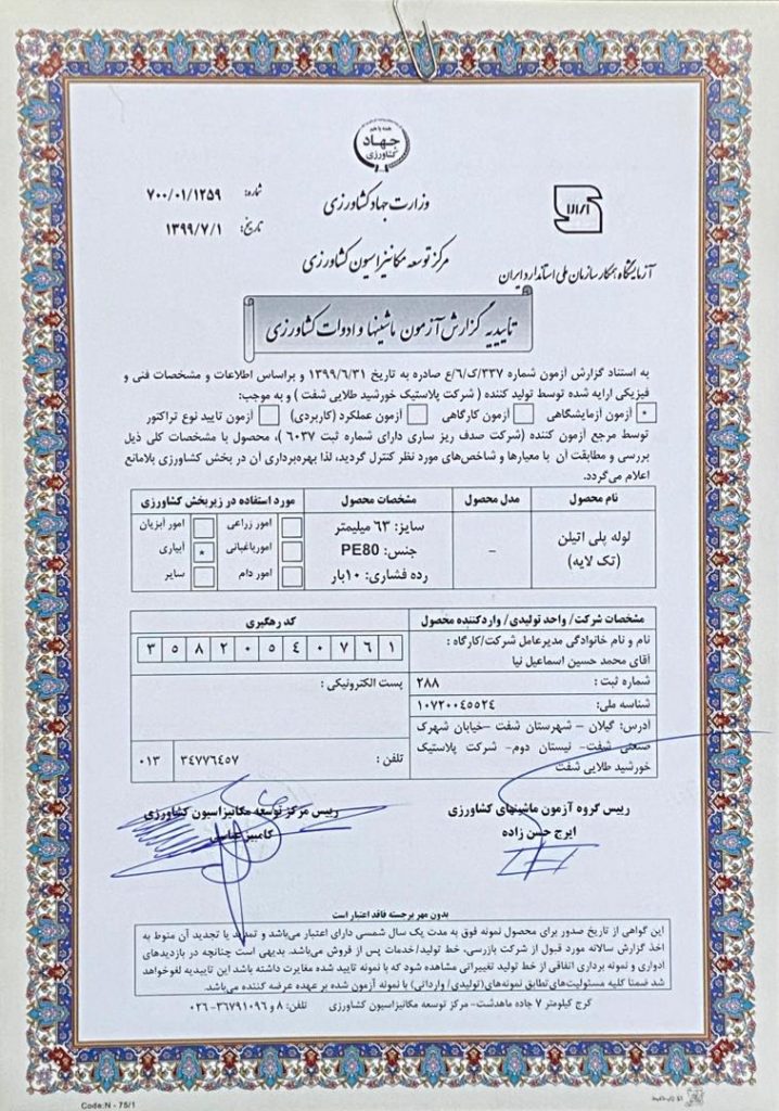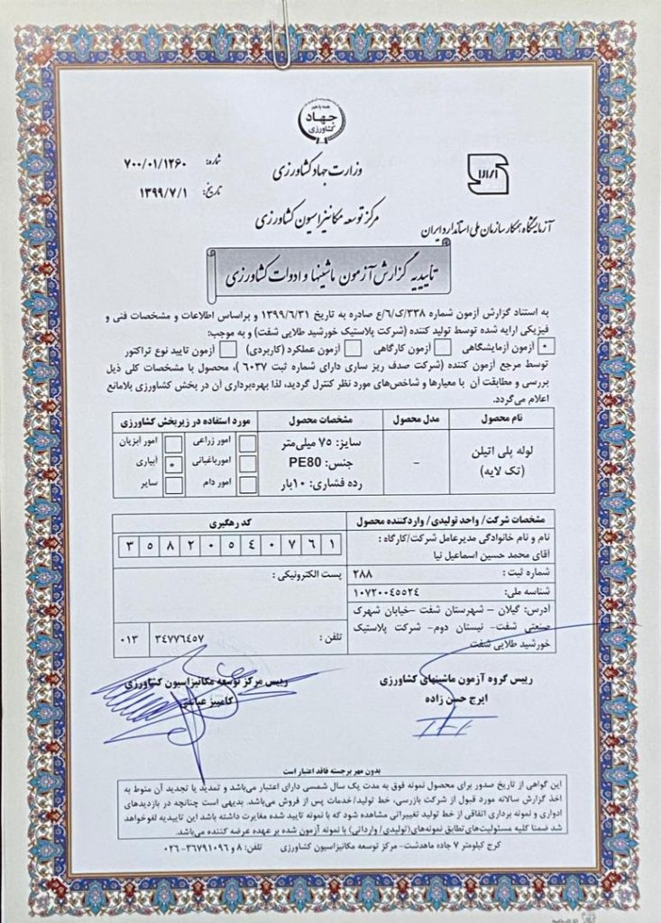 شرکت خورشید طلایی دارای نشان ملی استاندارد ایران، گواهی  ایزو9001  و  تاییدیه‌وزار‌ت‌جهاد‌کشاورزی است.