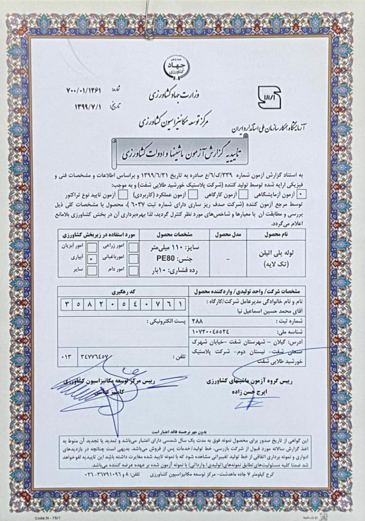 لازم به ذکر است که آزمایشگاه این شرکت مجهز به دستگاه های MFR و OIT و Tensile و تست هیدرواستاتیک و کوره حرارتی و میکروسکوپ و ترازوی دیجیتال بوده و با استفاده از دانش فنی کارکنان این بخش، بر کیفیت محصولات نظارت دایم صورت می گیرد.